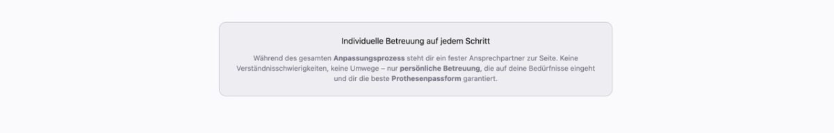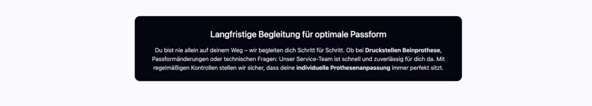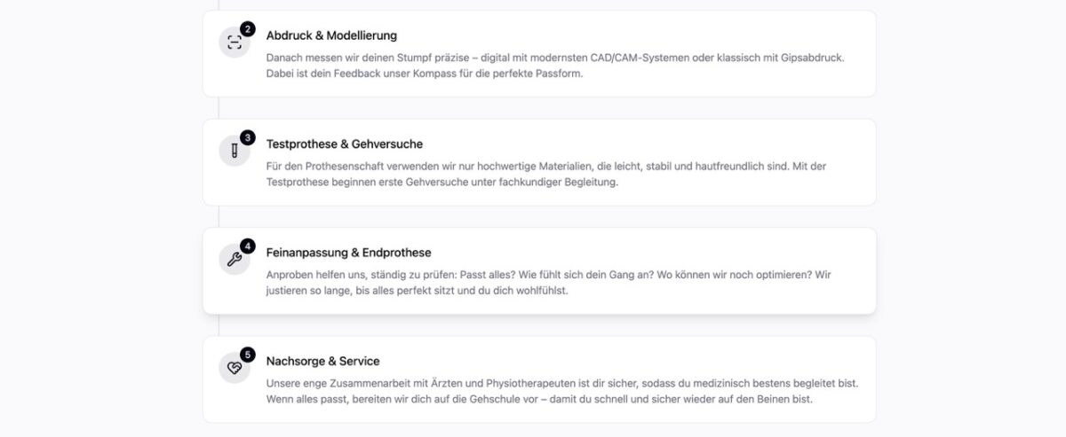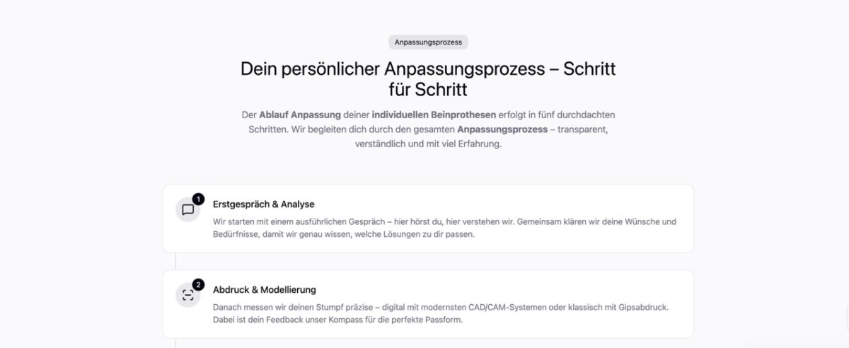 Der gesamte Anpassungsprozess dauert in der Regel zwischen 4 und 12 Wochen, abhängig von der Komplexität und deinen individuellen Bedürfnissen. Nach dem Erstgespräch und der Vermessung fertigen wir zunächst eine Testprothese an. Diese wird in mehreren Anproben optimiert, bis die Passform perfekt ist. Danach erfolgt die Fertigstellung der Endprothese mit abschließender Feinabstimmung und Gehschule.