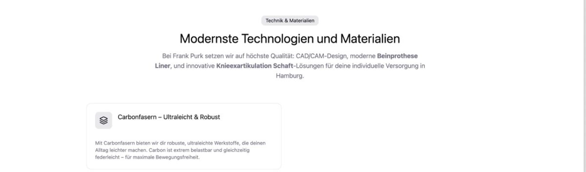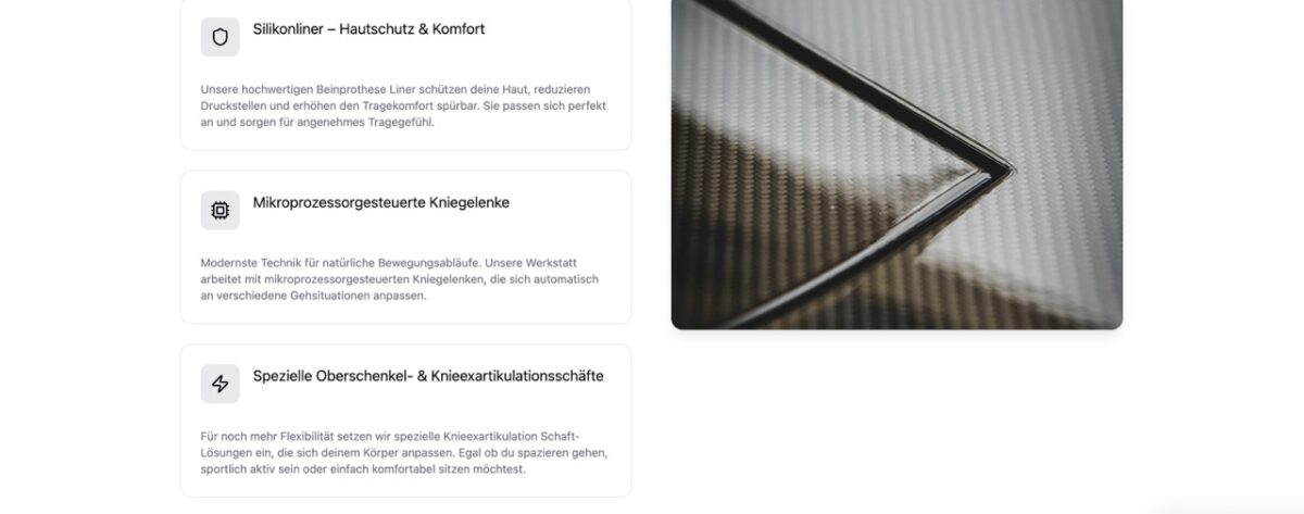 Wir verwenden modernste Materialien wie Carbonfasern für maximale Stabilität bei minimalem Gewicht, hochwertige Silikonliner für Hautschutz und Komfort, sowie mikroprozessorgesteuerte Kniegelenke für natürliche Bewegungsabläufe. Die Prothesenschaftherstellung erfolgt mit CAD/CAM-Technologie für höchste Präzision. Je nach Bedarf setzen wir auch spezielle Knieexartikulation Schäfte oder individuelle Oberschenkellösungen ein.